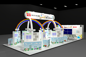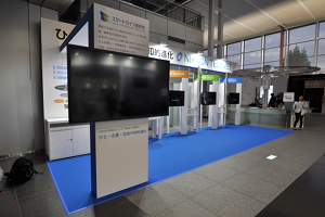 合同出展系のブースで、販路拡大に加えて連携・情報交換先の開拓を目的としたご出展でした。どこから見ても全企業が見えるような見通しを作りたいとのご希望に対して、構造体とディスプレイを一体化したデザインで見通しを実現しました。