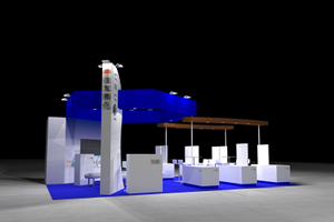 BtoB商材の化学メーカー様で、商材のもつ特徴から固いイメージになりがちなデザインに水のイメージを取り入れて、足を踏み入れやすいブースを目指しました。 -